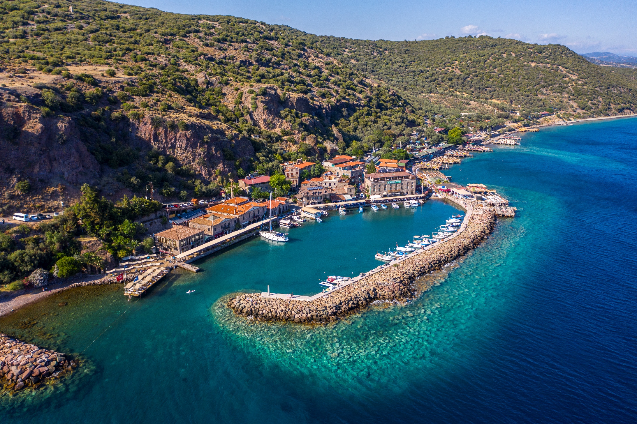 Assos offers numerous coves and beaches where you can dive into the infinite blue waters. Beautiful coves, such as Kadırga and Sivrice, pristine beaches like Sokakağzı, and many other lovely spots, including the Ancient Harbour, are among this unspoiled landscape’s authentic and untouched beauties. Kadırga Bay, on the other hand, stands out for its long, expansive shoreline and Blue Flag status. While the shores are mostly made up of large stones throughout Assos, people generally jump into the sea via wooden piers. It’s worth mentioning that the sea in Assos warms up a bit later due to its geographical location, and its waters are cooler compared to the Mediterranean. Another feature of Assos is its diverse accommodation options. You can choose from camping sites which you can day-trip to, small pensions, luxurious and comfortable hotels, and boutique hotels.
