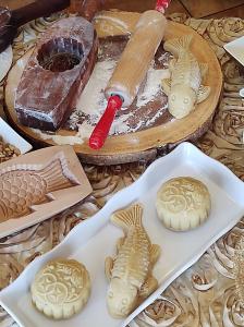 Some mooncakes, in addition to the filling, have a salted yolk in the middle to represent the moon. The addition of the salted yolk enhances the mooncake’s filling and adds a notable contrast to the pastry’s sweetness, and balances the sweet and savory combination. Modern flavors include matcha, black sesame, mocha, and more to cater to changing tastes. The most common type of mooncake is the Cantonese-style characterized by its lotus-like shape with a decorative pattern atop. Each mooncake is filled and rolled into a round ball, pressed into a decorative wood carved mold, and then knocked in a paddle motion to release a perfectly embossed piece of art that has a floral pattern, shape, or Chinese characters symbolizing good-luck, longevity, harmony, or prosperity.
