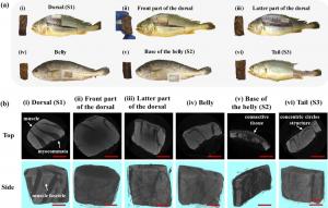 Based on micro-CT scanning data, a muscle/fat biphasic high-simulation model for 3D printing yellow croaker meat in three parts (the dorsal, the base of the belly flesh, and the tail) was constructed via CAD reconstruction,” explains Enbo Xu, senior and corresponding author of the study. “We used soy protein isolate–xanthan gum-starch complex as simulated muscle ink and nanostarch-carrageenan emulsion gel as simulated fat ink.