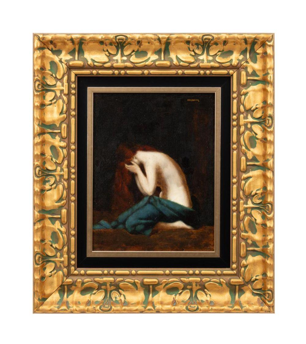 Oil on canvas figural rendering by French artist Jean Jacques Henner (1829-1905), titled The Distraught Woman (or Weeping Magdalene), 13 ¾ inches by 10 ¾ inches (canvas) ($27,225).