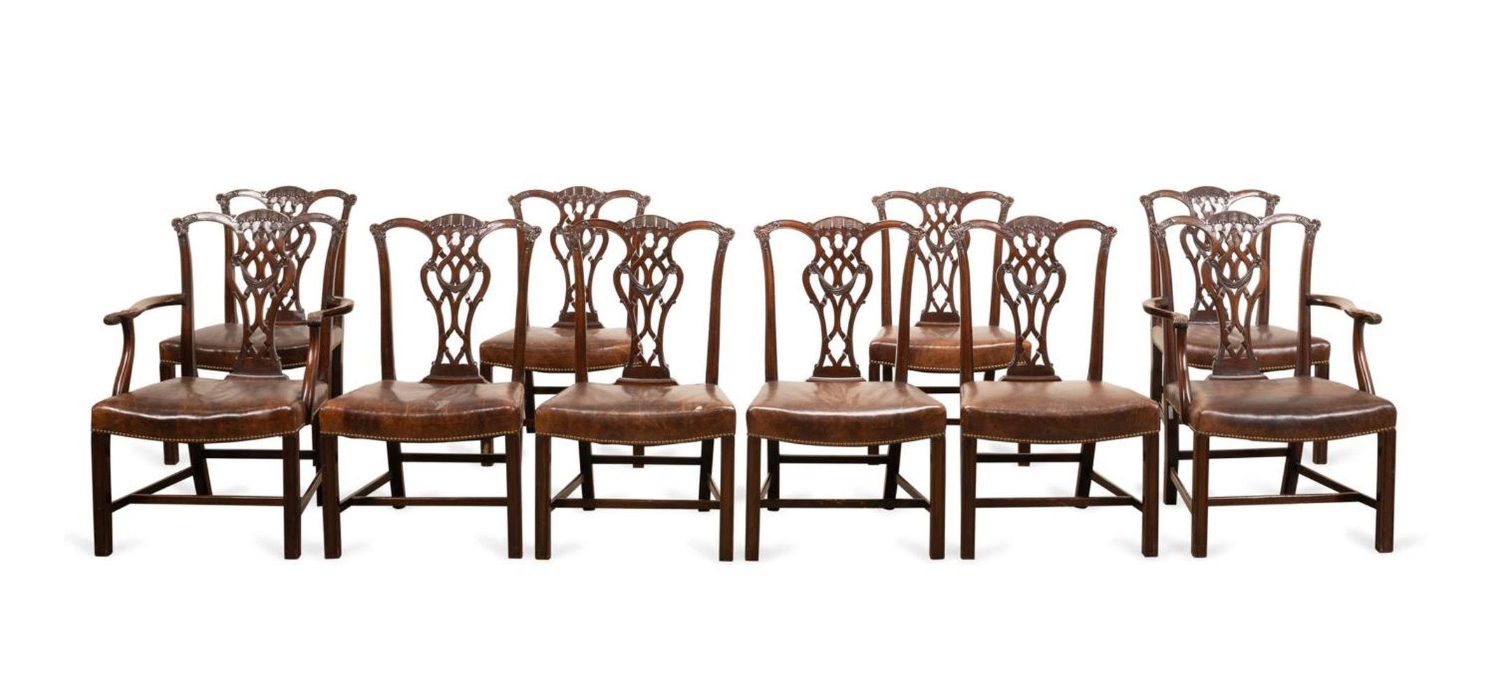 Set of ten early 20th century English Chippendale style mahogany dining chairs, each one outfitted with a leather saddle seat and nailhead trim ($6,050).