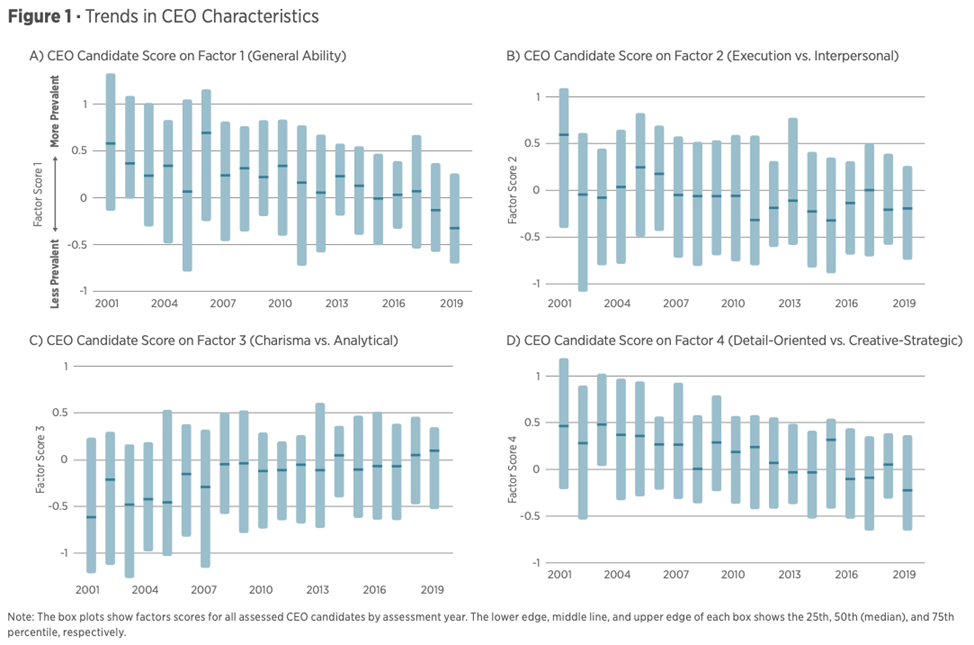 CEOs hired in recent years are similar in terms of their overall ability and interpersonal orientation to CEOs hired earlier. The same four factors revealed by earlier research still explain roughly half of the variation in CEOs’ characteristics: overall ability and whether they are more execution-oriented and less interpersonal, more analytical and less charismatic, or more creative and less detail-oriented.