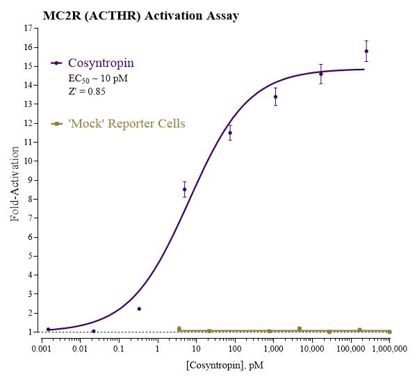 The Melanocortin 2 Receptor (MC2R), also known as the ACTH receptor, is essential in the body’s response to stress and is a key player in the hypothalamic-pituitary-adrenal (HPA) axis. MC2R mediates the effects of adrenocorticotropic hormone (ACTH), triggering the release of cortisol and other glucocorticoids, which are vital for maintaining homeostasis during stressful conditions. INDIGO's MC2R Reporter Assay enables researchers to precisely measure MC2R activation, facilitating the identification and characterization of potential drug candidates.
