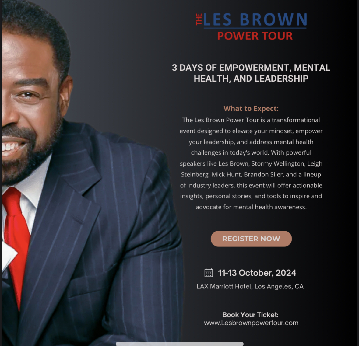 Hosted at the LAX Marriott Hotel, this exclusive event will feature keynote sessions, workshops, and a special Mental Health and Wellness Red Carpet Awards Gala on Saturday, October 12. Les Brown, recognized for his life-changing messages on personal development, mindset, and overcoming adversity, is extending a special offer: a 15% discount attend for those who serve individuals experiencing mental health challenges.