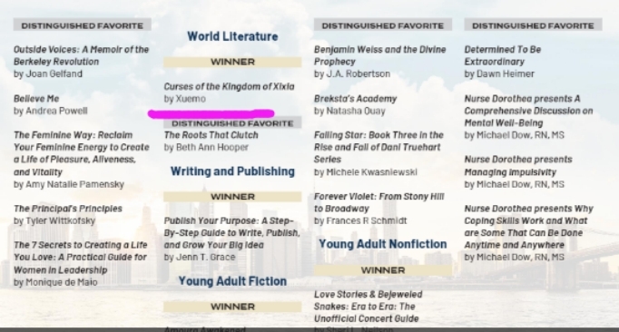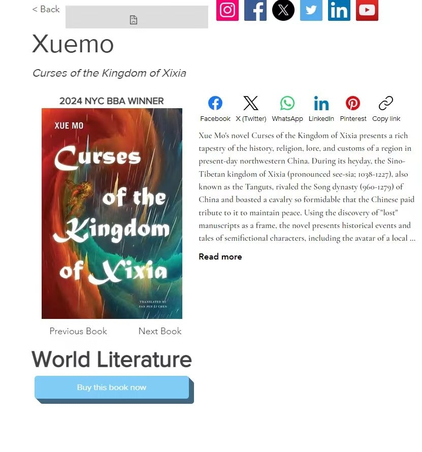 CHICAGO, IL, UNITED STATES, October 7, 2024 /EINPresswire.com/ -- On October 5, 2024, the panel for the "New York City Book Award" officially announced on its website that acclaimed writer Xue Mo's representative work “Curses of the Kingdom of Xixia”, translated by Fan Pen Li Chen and published by SUNNY PRESS, has won the Gold Medal at the 2024 NYC BIG BOOK AWARD in the World Literature Category. The Journal of the 2024 New York Book Awards also revealed its list of winners.