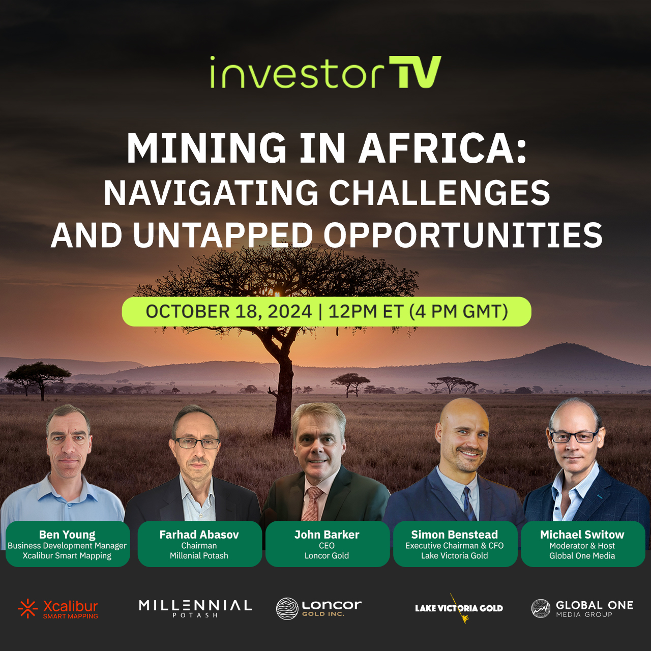 TORONTO, ONTARIO, CANADA, October 10, 2024 /EINPresswire.com/ -- investorTV, a digital platform powered by Global One Media that brings together industry experts, corporate leaders, and investment professionals for live panel discussions on key market topics, announces its upcoming live panel event, "Mining in Africa: Navigating Challenges and Untapped Opportunities.” Scheduled for October 18, 2024, at 12 PM EST (4 PM GMT), this exclusive panel discussion will feature a group of mining industry experts who will shed light on the untapped potential and unique challenges of one of the world's most resource-rich and dynamic mining regions.The hour-long event will be moderated by Michael Switow, a seasoned media veteran renowned for his coverage of global markets. The distinguished panel includes:
