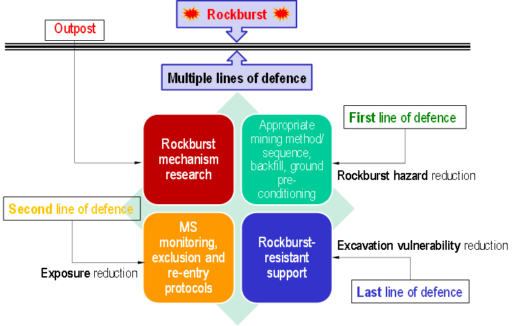 In particular, improved mine design and mining sequencing aim at reducing the rockburst hazard is the first line of defense, while microseismic monitoring for mitigating the consequences of rockburst is the second line of defense. For the last line of defense, rockburst-resistant support can be employed to reduce the vulnerability of mine excavations.
