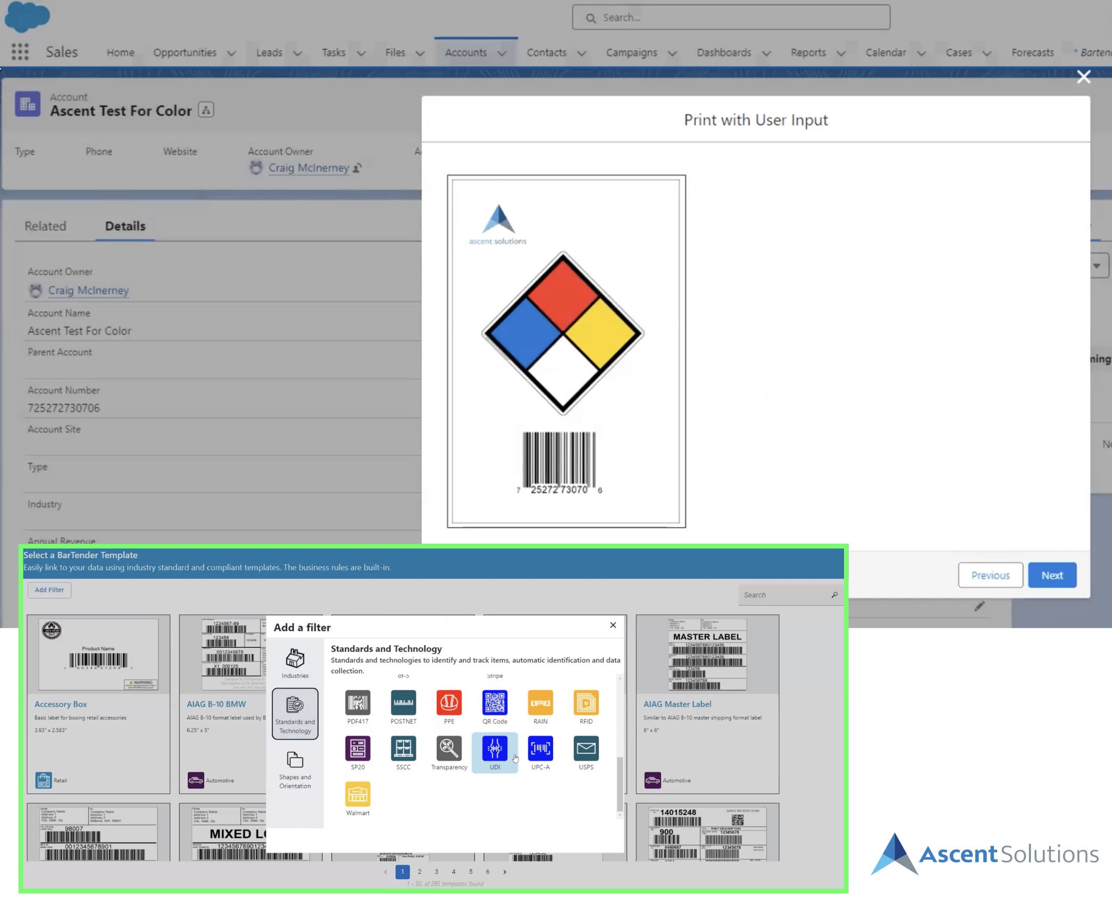 Ascent Label Anything with Bartender Cloud on Salesforce