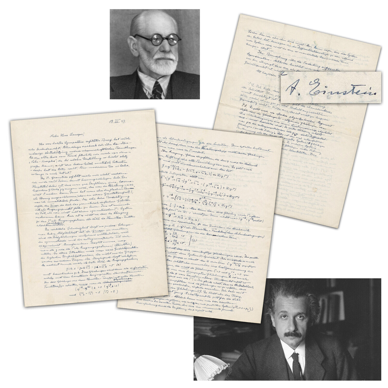 Lot 447 is a 3-page autograph letter in German signed by Albert Einstein in which the scientist explores both his Unified Field Theory and General Relativity. The very long scientific letter, addressed to Einstein’s friend and fellow physicist Cornelius Lanczos, includes 12 equations in Einstein's hand, as well as humorous content relating to Sigmund Freud (est. $40,000-$50,000).