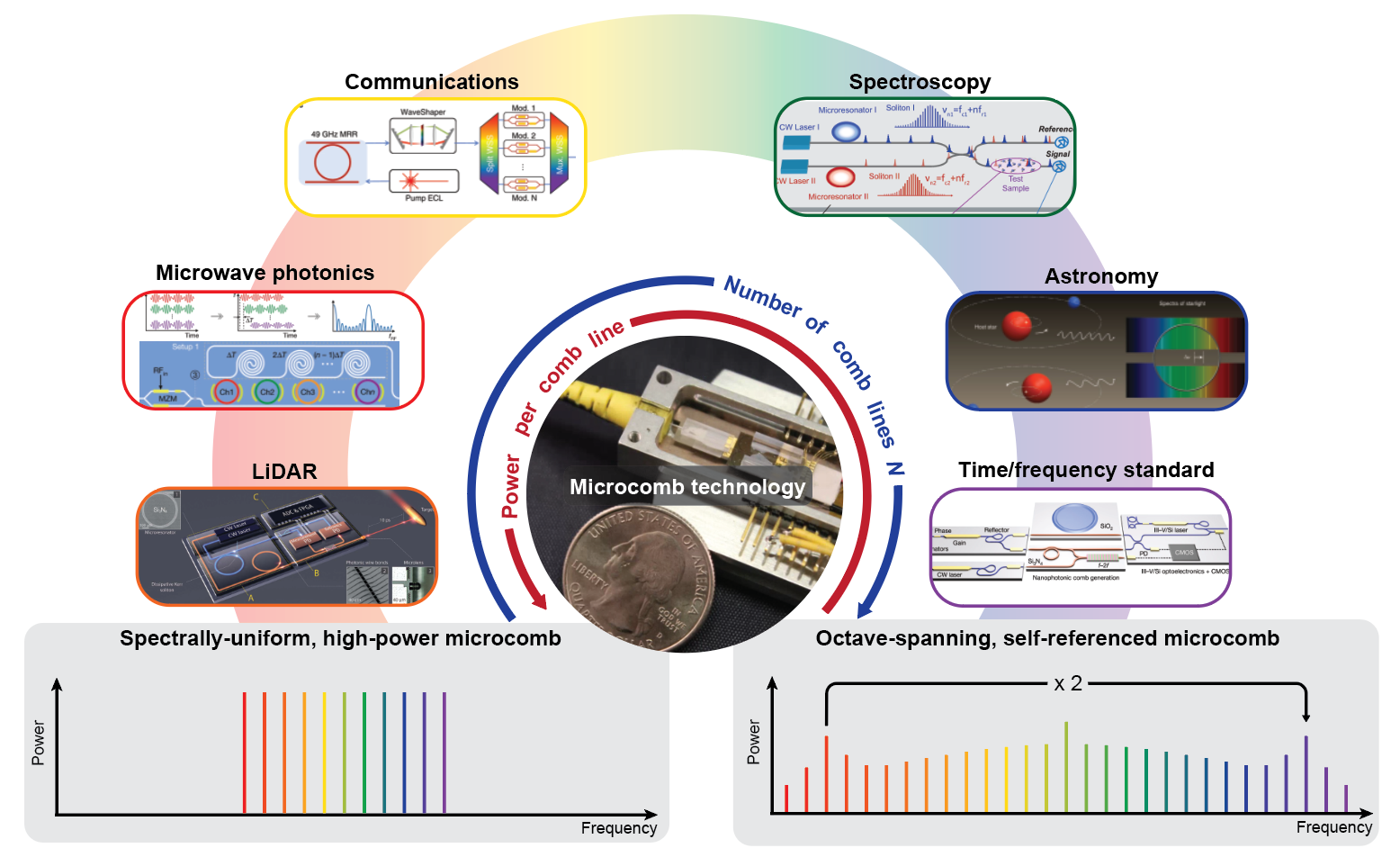 The efficiency of microcombs is a critical metric for their practical applications. Recent advancements have focused on improving efficiency through coupled resonators and broader pumping strategies. Notable progress has been made in generating flat-top microcombs, which distribute power evenly across the comb lines. This uniform power distribution is essential for modern communication systems and other applications that rely on consistent signal strength across multiple channels.
