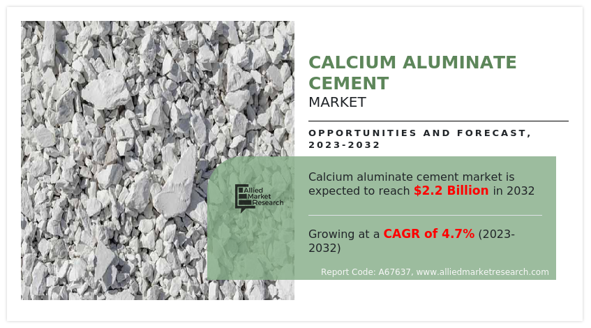 WILMINGTON, DE, UNITED STATES, October 16, 2024 /EINPresswire.com/ -- Allied Market Research recently published a report titled "Calcium Aluminate Cement Market by Product Type (CAC 40, CAC 50, CAC 60, CAC 70, CAC 80, and Others) and End-Use Industry (Construction, Oil & Gas, Refractory, Water & Wastewater Treatment, and Others): Global Opportunity Analysis and Industry Forecast, 2022-2032". According to the report, the global calcium aluminate cement market was valued at $1.4 billion in 2022 and is expected to reach $2.2 billion by 2032, growing at a CAGR of 4.7% from 2023 to 2032.Download Sample Pages of Research Overview: https://www.alliedmarketresearch.com/request-sample/A67637