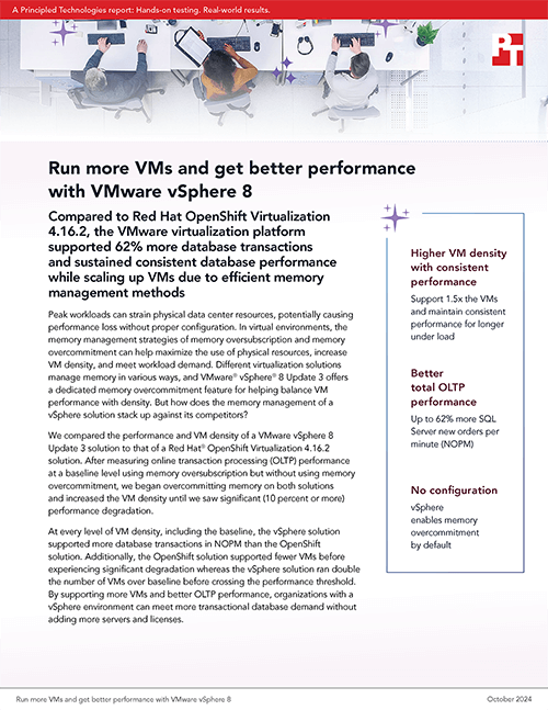 PALO ALTO, CA, UNITED STATES, October 18, 2024 /EINPresswire.com/ -- A new report from third party Principled Technologies (PT) shows that VMware vSphere 8 Update 3 outperformed Red Hat OpenShift Virtualization 4.16.2 in terms of online transaction processing (OLTP) database performance virtual machine (VM) density. These advantages were due in part to the vSphere memory oversubscription and memory overcommitment features, which allow organizations to take advantage of more of their existing infrastructure’s resources.The report demonstrates that a VMware vSphere 8 solution supported up to 62% more SQL Server new orders per minute (NOPM) compared to a Red Hat OpenShift Virtualization solution.