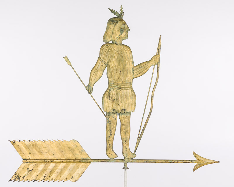 Circa-1890 American gilded copper ‘Indian’ weathervane. Swell-bodied figure with sheet-copper feathers as headdress holds bow and arrow. Height: vane 41in; inclusive of stand 74in. Provenance: Bridgehampton, N.Y. private collection. Estimate: $60,000-$80,000
