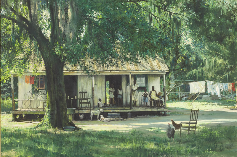 Also estimated at $60,000-$80,000, an atmospheric oil-on-canvas painting by Clark Hulings (1922-2011) is titled Louisiana and has resided with the same family since its pre-1972 purchase from New York’s Grand Central Gallery. Hulings was born in Florida and raised in New Jersey. Over his lifetime, he resided in New York, Louisiana, and throughout Europe before settling in Santa Fe, New Mexico, in 1972. After pursuing an initial career as a portraitist in Louisiana and freelance illustrator in New York in the 1950s, Hulings turned his focus to easel painting and soon distinguished himself as an American master of his genre, with collectors, museums and corporations eager to acquire his pictures. The auction artwork, which depicts a cottage with people on the front porch and dogs and chickens in the front yard, exemplifies Huling’s ability to capture on canvas the simple pleasures of Southern rural life.