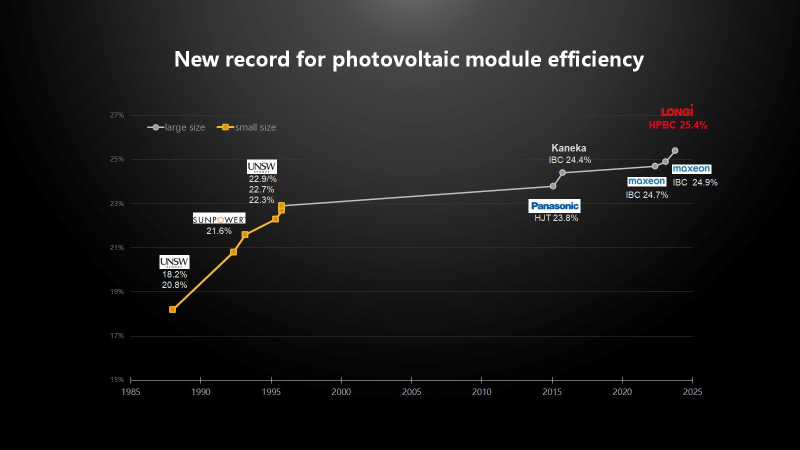The module efficiency has reached 25.4%, which is a significant and historic leap compared with the slow improvement in efficiency in the past decade, breaking the benchmark of the world record of 25% for crystalline silicon module efficiency of Martin Green and NREL, and breaking the 24.9% IBC module efficiency created by Maxeon in January this year.
