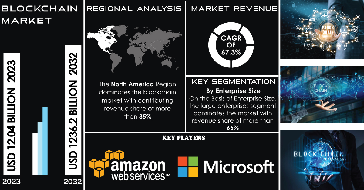 The Blockchain Market was valued at USD 12.04 billion in 2023 and is projected to grow to USD 1,236.2 billion by 2032, achieving a remarkable compound annual growth rate (CAGR) of 67.3% over the forecast period from 2024 to 2032.