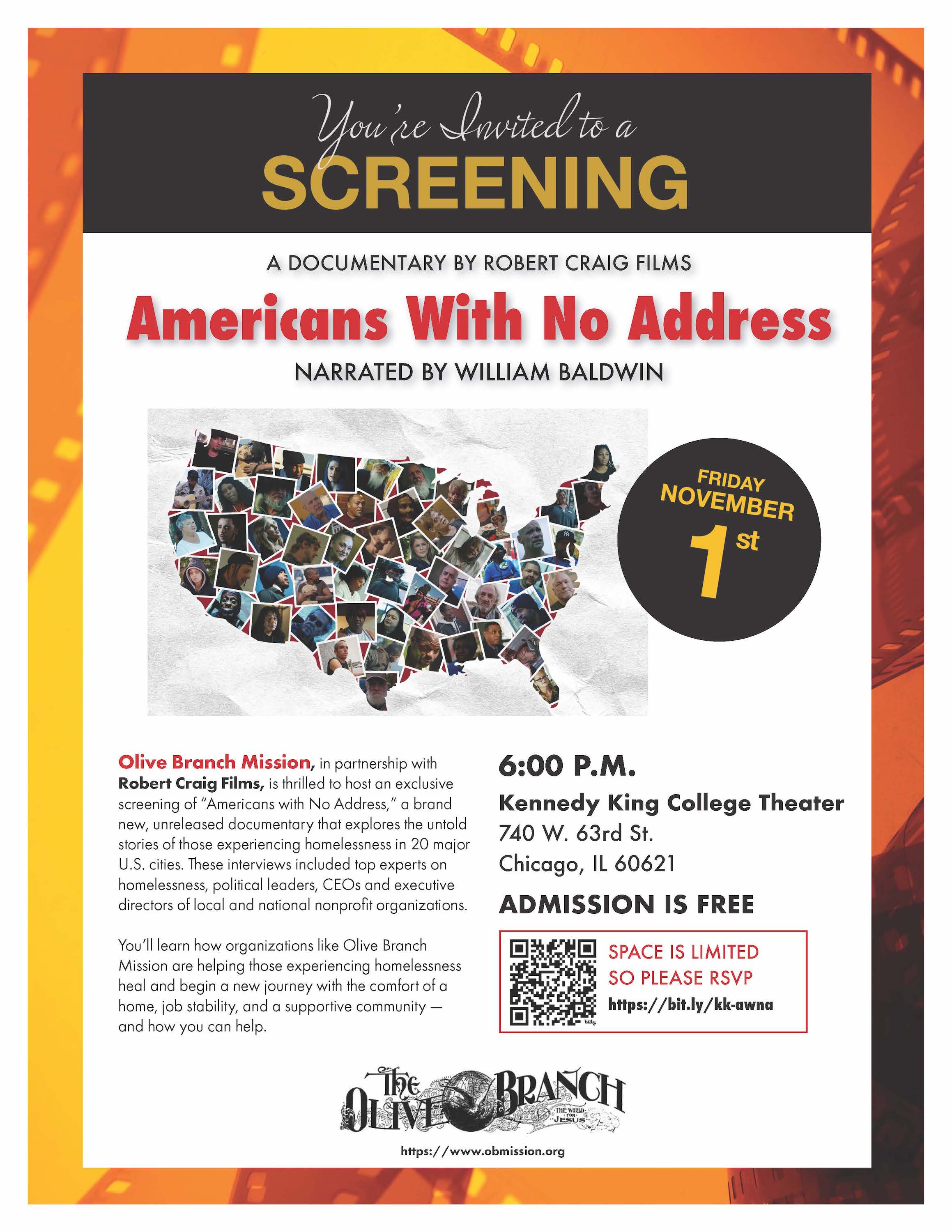 CHICAGO, IL, UNITED STATES, October 29, 2024 /EINPresswire.com/ -- On Friday, November 1st, Olive Branch Mission is hosting a second exclusive screening of an unreleased documentary title “Americans With No Address.” Narrated by actor William Baldwin, this film exemplifies the increasing homeless crisis sweeping America and captures the untold stories of those experiencing life on the streets.Olive Branch Mission invites the media to attend along with various local lawmakers and faith leaders to view this eye-opening screening this Friday, November 1st at 6:00pm at Kennedy King College located at 740 W. 63rd Street, Chicago, IL 60621. The purpose of the event is to raise awareness and initiate solution-based conversations about the increasing human cost of homelessness. Watch the trailer here.