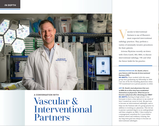 This feature in Arizona Physician aligns with the mission of the Maricopa County Medical Society (MCMS), an organization dedicated to advancing the practice of medicine and serving as a trusted source of expertise. VIP is honored to be recognized for its leadership in interventional radiology, reflecting the organization’s commitment to elevating healthcare standards.