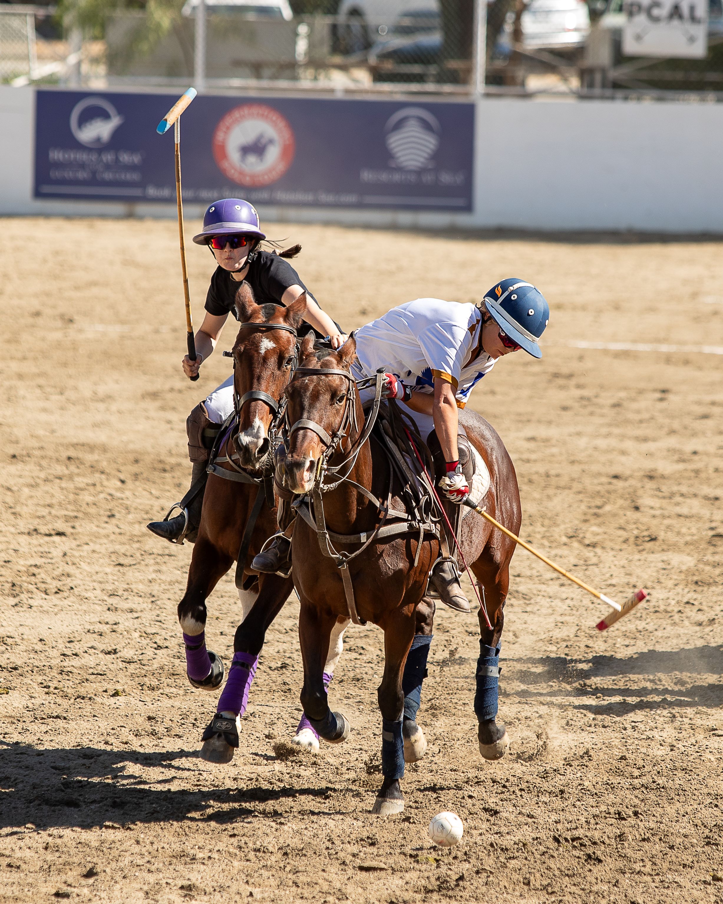 Fawn Rinalduzzi and Luca Abboud battle in the saddle during Pacific Coast Arena League (PCAL) at California Polo Club photo credit Tequila Sunsets Photography