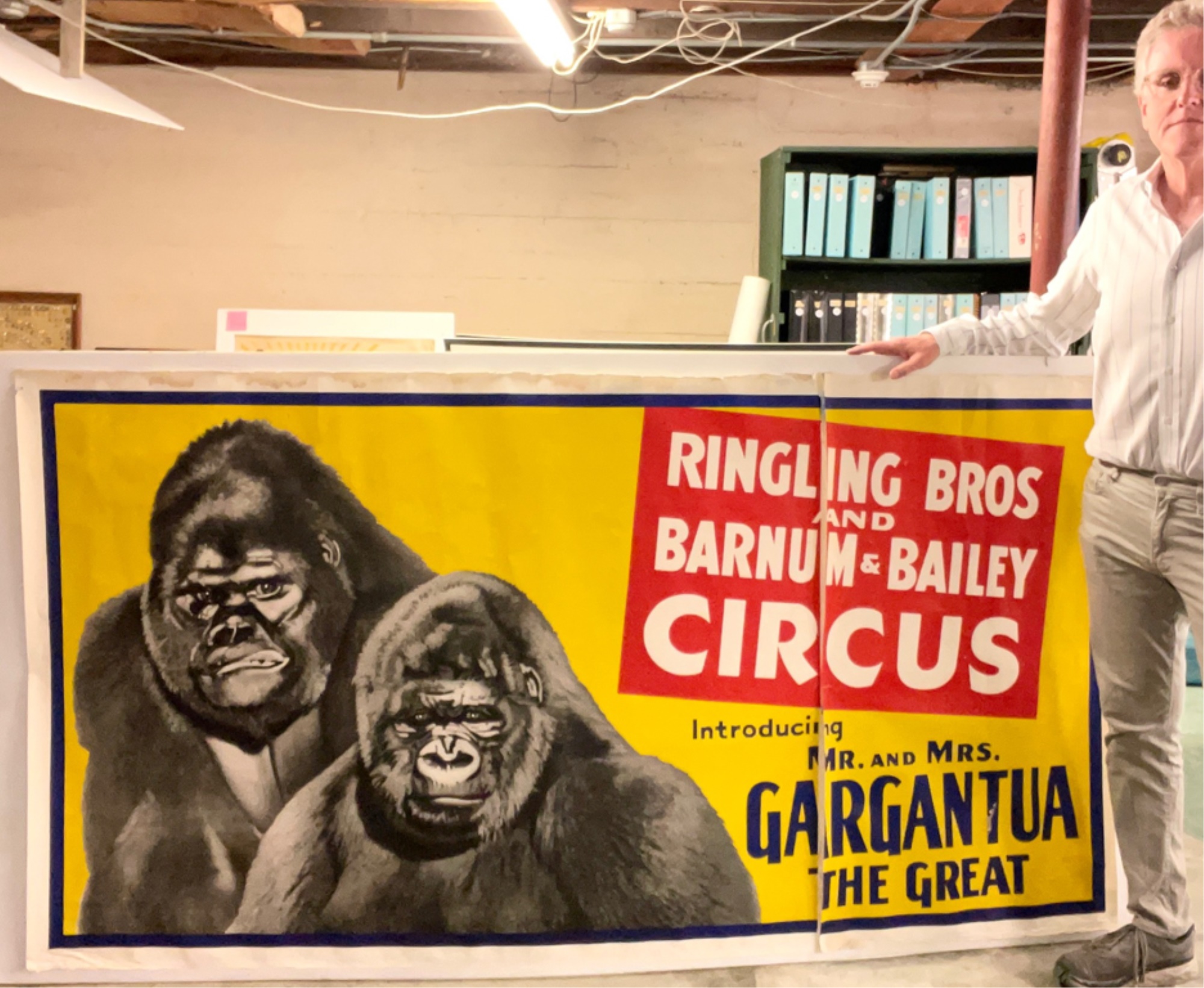 Lot #1 is a triple-sheet example of the rare and highly desirable Ringling Brothers and Barnum & Bailey Circus Mr. and Mrs. Gargantua the Great “gorilla” poster. Opening bid: $1.