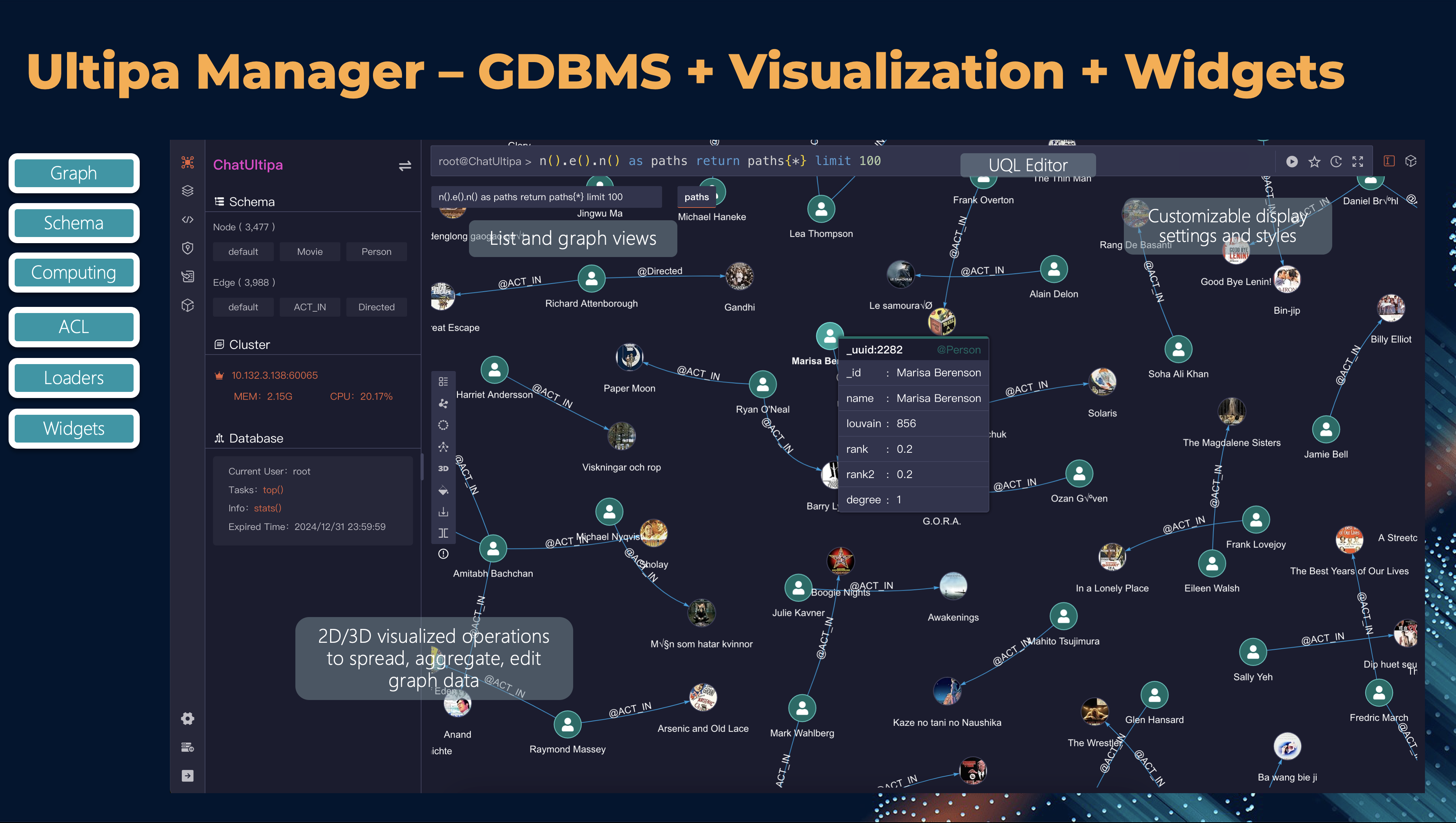 Unlike most graph databases, Ultipa stands out by offering advanced data visualization capabilities through Ultipa Manager, its graph DBMS that serves as a one-stop-shop for building and exploring graph data. Ultipa Manager’s extensible widget framework allows users across technical and business domains to build custom visualizations and analytics quickly and easily, enhancing the accessibility and usability of data insights.