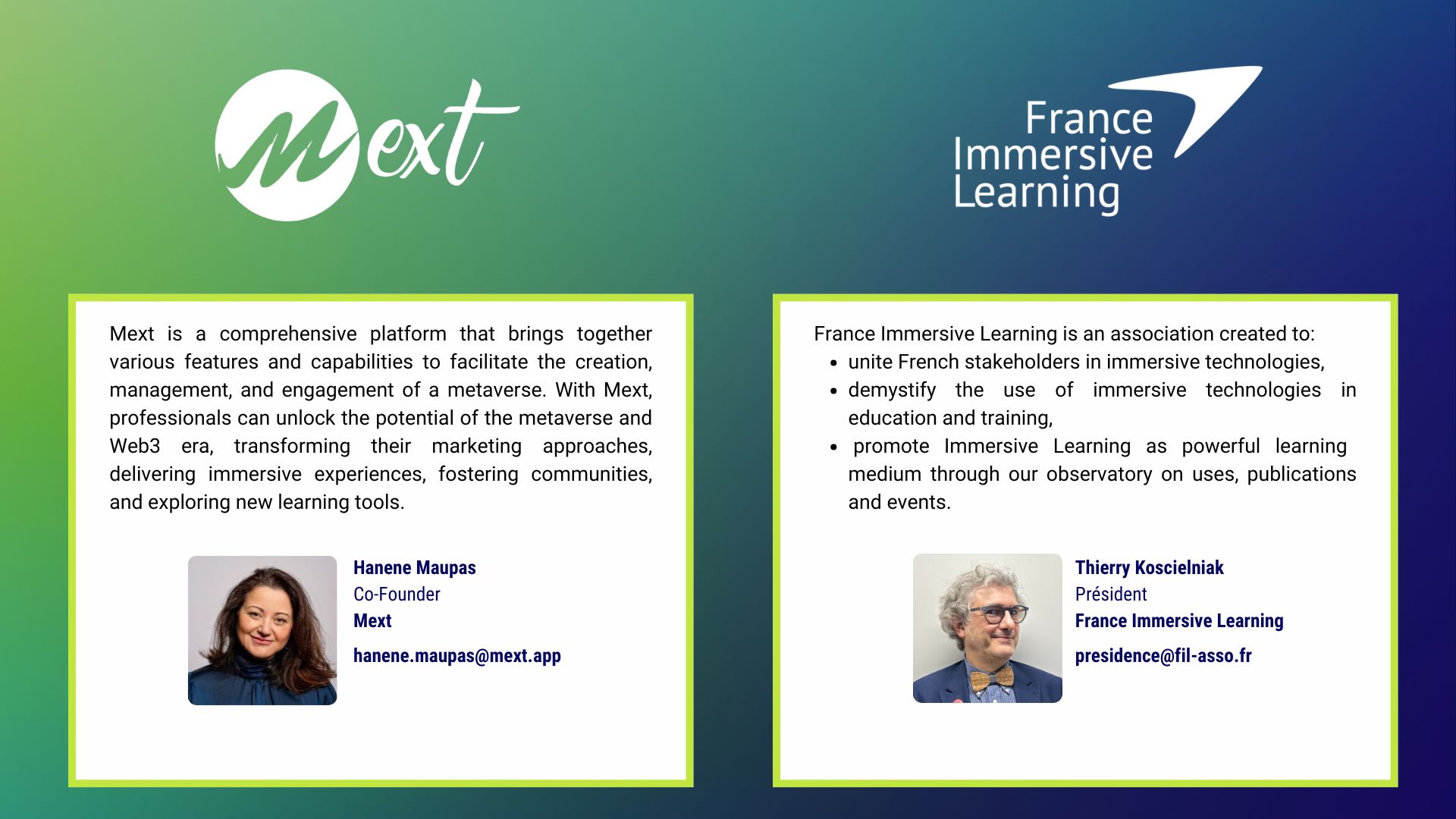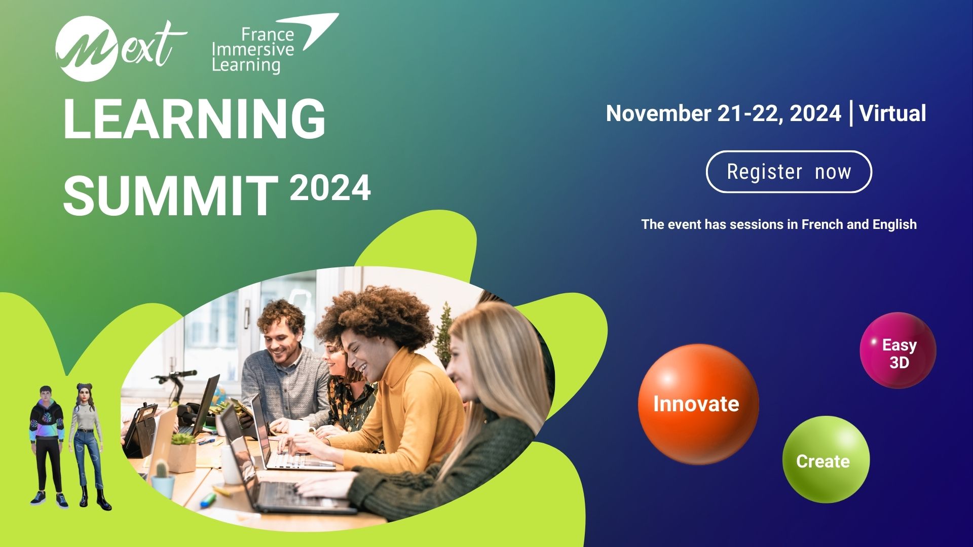 PARIS, FRANCE, November 6, 2024 /EINPresswire.com/ -- Mext, a leading provider of 3D immersive and interactive space authoring tools for learning, and France Immersive Learning, the French association championing immersive learning, are proud to announce their partnership in organizing The Immersive Learning Summit. This highly anticipated event will take place on November 21-22, under the theme "Empower Digital Natives with Tailored Education." Together, we aim to reshape the future of education and workforce training, ensuring the prosperity of societies through innovative, immersive technologies.Le sommet réunira des leaders de l'apprentissage et du développement (L&D), des ressources humaines, de la conception pédagogique, du développement de contenu eLearning, de la formation virtuelle, et plus encore. Avec une approche adaptée pour répondre aux besoins uniques des natifs du numérique, l'événement proposera des discussions et des démonstrations pratiques qui montrent comment l'apprentissage immersif et l'IA peuvent créer des expériences éducatives transformatrices. Les participants exploreront comment les nouvelles générations - des apprenants uniques enrichis par diverses connaissances extrascolaires et informelles - peuvent créer des expériences éducatives transformatrices.