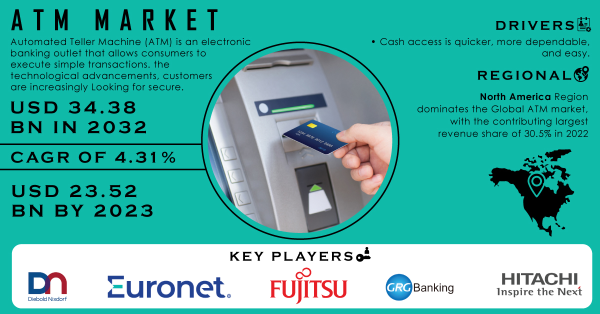 AUSTIN, TX, UNITED STATES, November 8, 2024 /EINPresswire.com/ -- Market Scope and OverviewThe ATM Market was valued at USD 23.52 billion in 2023 and is projected to reach USD 34.38 billion by 2032, growing at a steady CAGR of 4.31% from 2024 to 2032.
