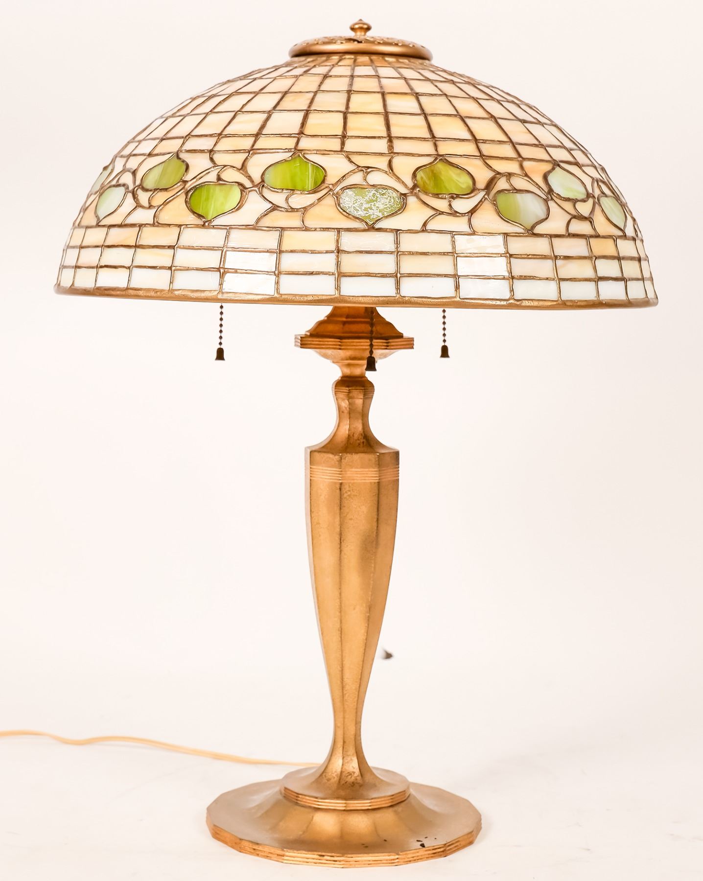 Authentic Tiffany Studios (N.Y.) three-bulb table lamp with leaded glass Acorn design shade and gilted bronze base, like new, in immaculate condition, zero flaws (est.$20,000-$50,000).