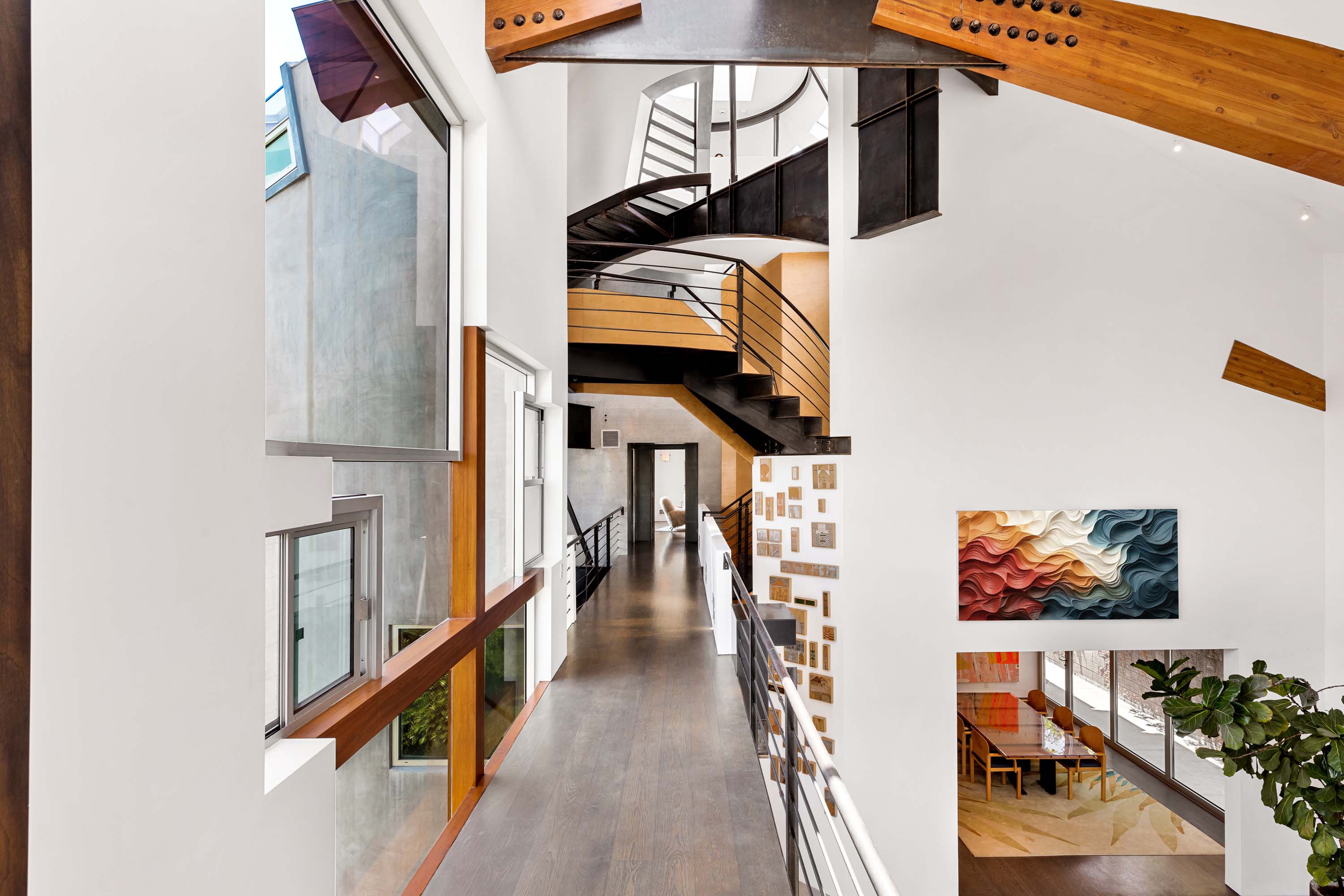 Located at 167 South Westgate Avenue, Constellation 167 stands as an exceptional tribute to Eric Owen Moss’ trailblazing design philosophy. Known for pushing the boundaries of modern architecture, the home embodies Moss’ style, a tribute to geometry, nature, and bold design. A culmination of years of meticulous restoration and design, the home features striking, smooth concrete exterior angles that converge in a magnificent dome, creating an otherworldly visual experience. Inside, light flows effortlessly across terrazzo floors, burnished steel beams, and custom mahogany finishes, offering an environment of constant discovery and inspiration for its residents. The property features wide-plank oak and terrazzo flooring, museum-quality glass, radiant heat floors, and a custom glass and wood entryway that elevates the home’s modern aesthetic.