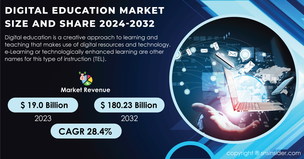 AUSTIN, TX, UNITED STATES, November 12, 2024 /EINPresswire.com/ -- Market Scope and OverviewThe Digital Education Market, valued at USD 19.0 billion in 2023, is expected to reach an impressive USD 180.23 billion by 2032, growing at a remarkable CAGR of 28.4% from 2024 to 2032.