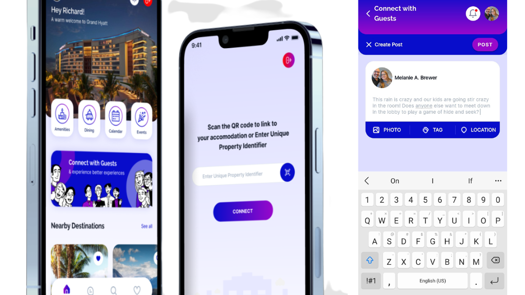 Away Together is a mobile application that allows secure and sustainable communication for hotels to guests, and guest to guest. It showcases everything the hotel has to offer, including menus, amenities and up-sell opportunities, perfect for small to medium sized accommodations who don’t have the financial resources, or the time, to create their own mobile application. Additionally, as opposed to rack cards in the lobby, Away Together allows for the location to advertise directly to the traveler, increasing the ability for a traveler to truly experience the culture and history of a location. By highlighting and bringing to the forefront opportunities for travelers to volunteer, immerse themselves in the culture, yet level the playing field for all participants. The application also promotes responsible tourism, encouraging visitors to support local businesses, and participate in sustainable practices. This not only helps in preserving local culture and heritage but also fosters a healthy relationship between the visitors and the community.