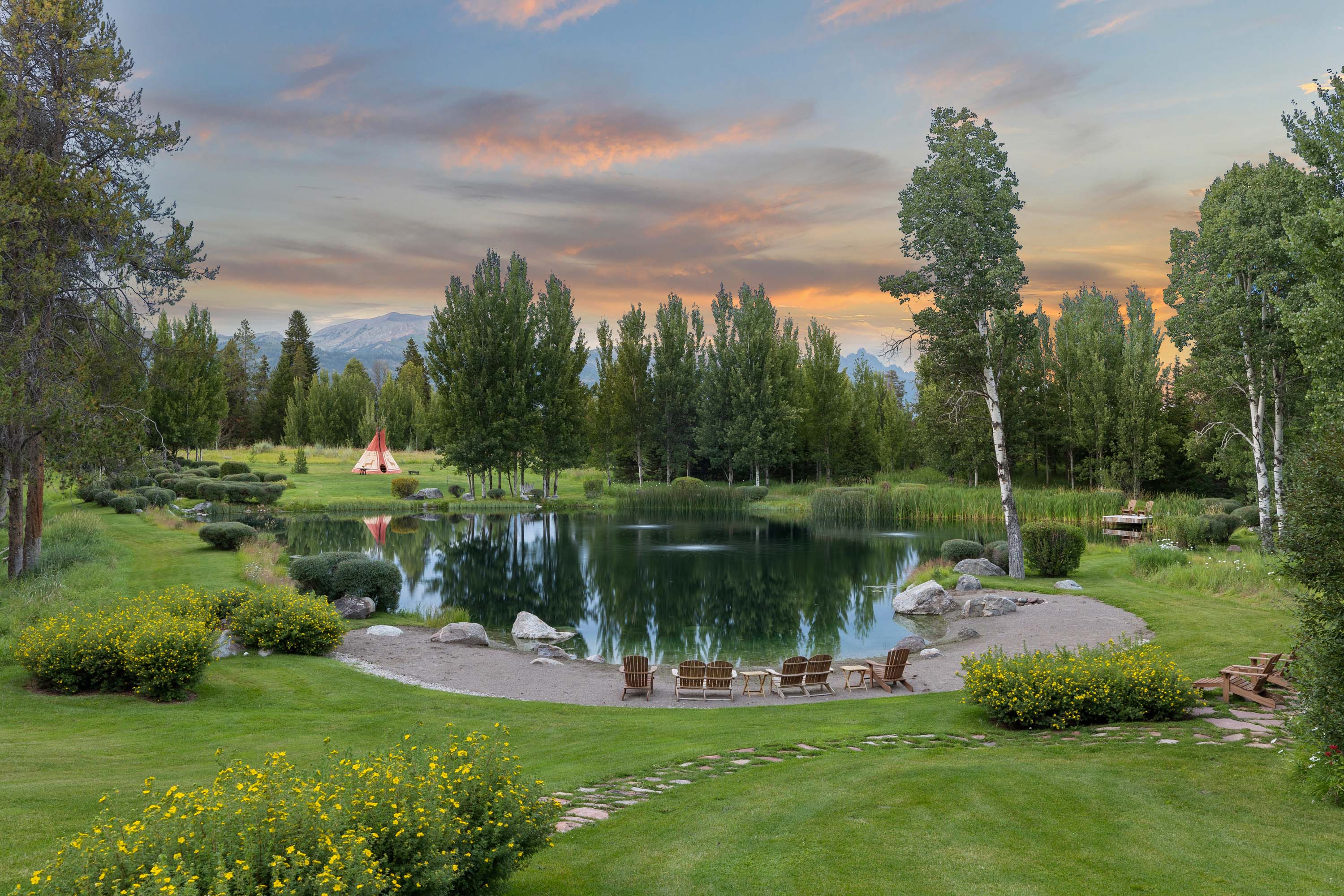 The expansive grounds offer a private swimming pond, sandy beach, and dock perfect for entertaining, as well as two historic cabins for additional storage. The estate is bordered by millions of acres of protected National Forest, providing unparalleled access to hiking, fishing, and outdoor adventures. Grand Teton National Park is just 15 miles away, while Yellowstone National Park is a short drive away.