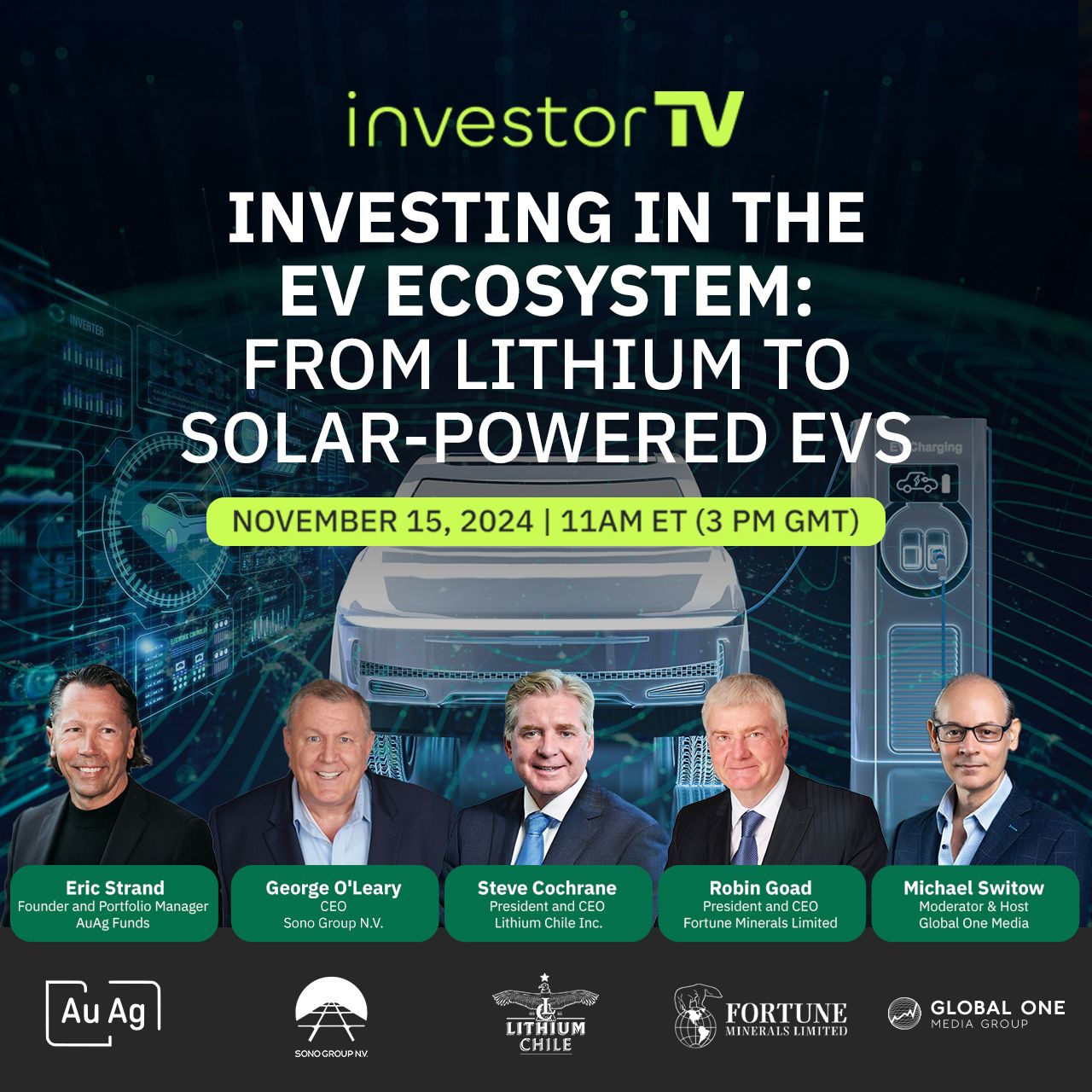 TORONTO, ONTARIO, CANADA, November 14, 2024 /EINPresswire.com/ -- investorTV, a digital platform powered by Global One Media that brings together industry experts, corporate leaders, and investment professionals for live panel discussions on trending market topics, announces its upcoming live panel event, "Investing in the EV Ecosystem: From Lithium to Solar-Powered EVs." Scheduled for November 15, 2024 at 11 AM EST (3 PM GMT), this exclusive panel discussion will feature industry leaders who will analyze the rapidly evolving electric vehicle landscape, from market dynamics to technological innovations.The hour-long event will be moderated by Michael Switow, a seasoned media veteran renowned for his coverage of financial markets. The expert panel includes: