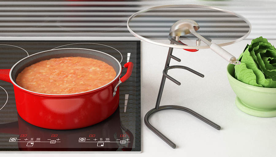 The device is comprised of a tubular, metal stand featuring two U shaped projections that can receive a number of lids and kitchen utensils depending on their various sizes. The base supports the extending system upward at a 65-degree angle and is very stable.