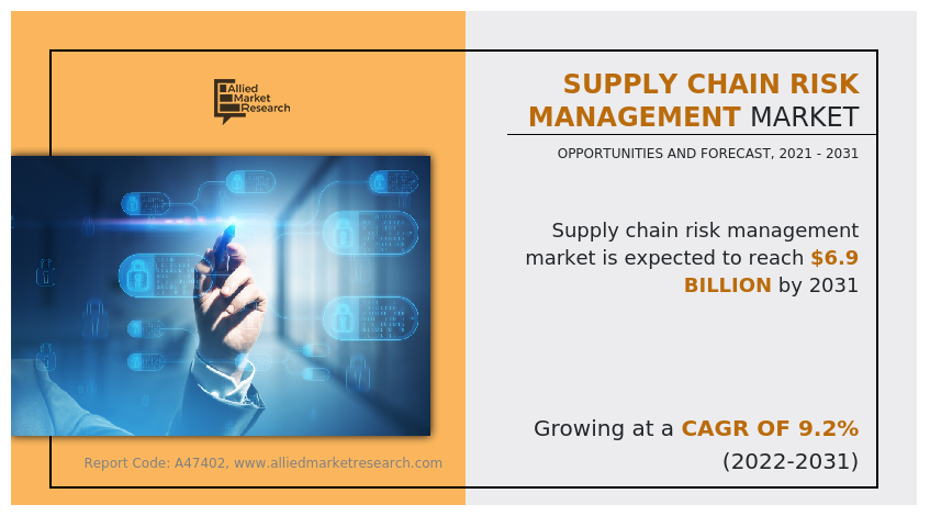 WILMINGTON, NEW CASTLE, DE, UNITED STATES, November 15, 2024 /EINPresswire.com/ -- The global 𝐒𝐮𝐩𝐩𝐥𝐲 𝐂𝐡𝐚𝐢𝐧 𝐑𝐢𝐬𝐤 𝐌𝐚𝐧𝐚𝐠𝐞𝐦𝐞𝐧𝐭 𝐌𝐚𝐫𝐤𝐞𝐭 size was valued at $2.9 billion in 2021, and is projected to reach $6.9 billion by 2031, growing at a CAGR of 9.2% from 2022 to 2031. Surge in need for comprehensive supply chain risk management solutions, increased government regulations and standards, an increase in urbanization, rise in traffic congestion, initiatives and developments by government & industry players across the country, and digital revolution in the transportation sector drive the growth of the global supply chain risk management market. However, data security issues and manual risk management processes restrict the market growth. On the other hand, standardization of risk assessment processes across organizations, as well as the integration of advanced technologies will present new growth opportunities for the global SCRM market in the coming years.𝐃𝐨𝐰𝐧𝐥𝐨𝐚𝐝 𝐒𝐚𝐦𝐩𝐥𝐞 𝐑𝐞𝐩𝐨𝐫𝐭 (𝐆𝐞𝐭 𝐅𝐮𝐥𝐥 𝐈𝐧𝐬𝐢𝐠𝐡𝐭𝐬 𝐢𝐧 𝐏𝐃𝐅 - 279 𝐏𝐚𝐠𝐞𝐬) 𝐚𝐭: https://www.alliedmarketresearch.com/request-sample/A47402