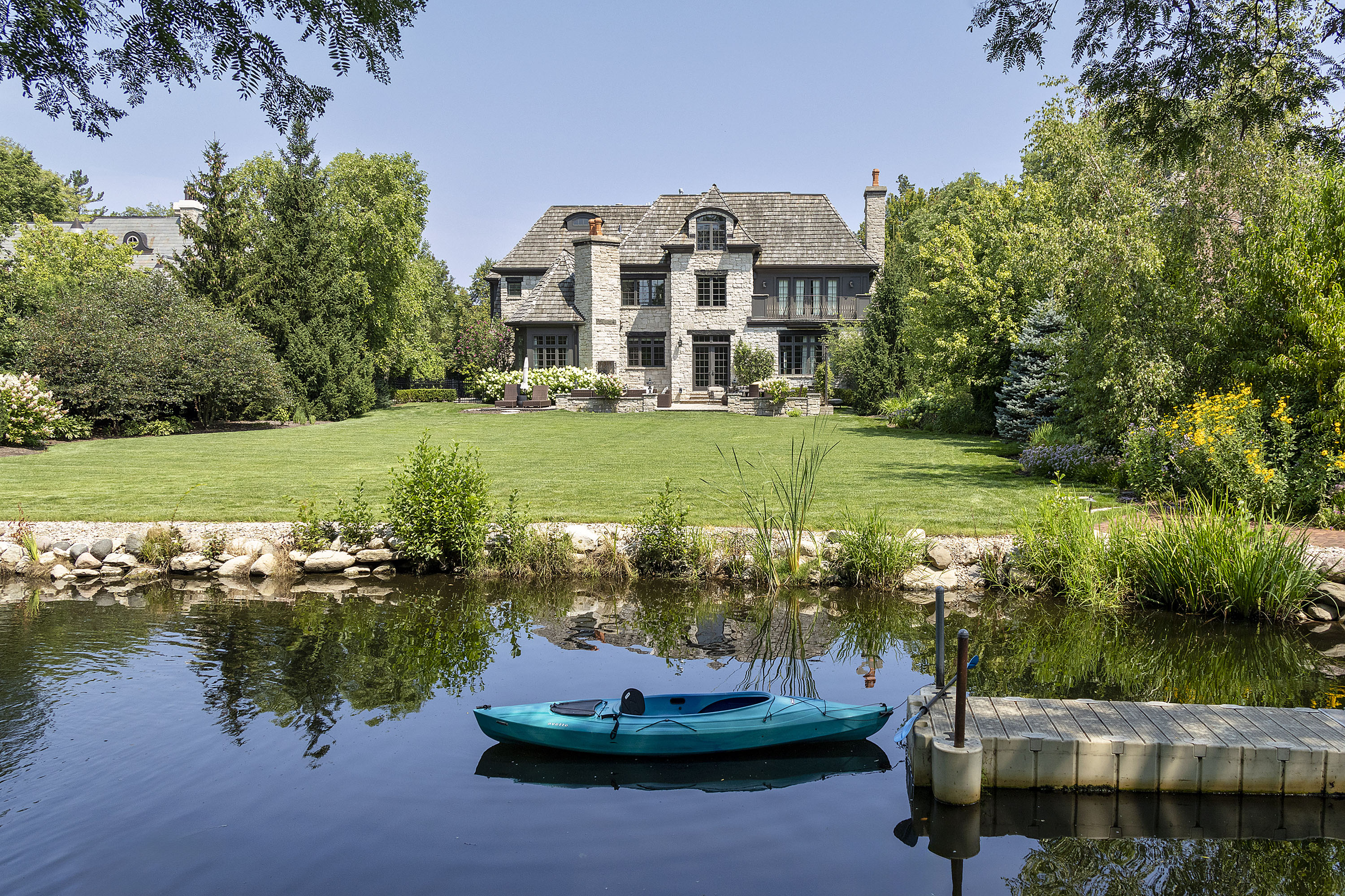 Situated on a private peninsula with 111 feet of lake frontage, this 12,998-square-foot estate blends outdoor recreation with luxury living. Longmeadow Lake offers kayaking, paddleboarding, ice skating, and fishing. A US Army Corps of Engineers retaining wall protects the shoreline, and a floating dock ensures easy lake access. The serene backyard, with lush landscaping and a fire pit, is ideal for entertaining, with room for a pool or sports court.