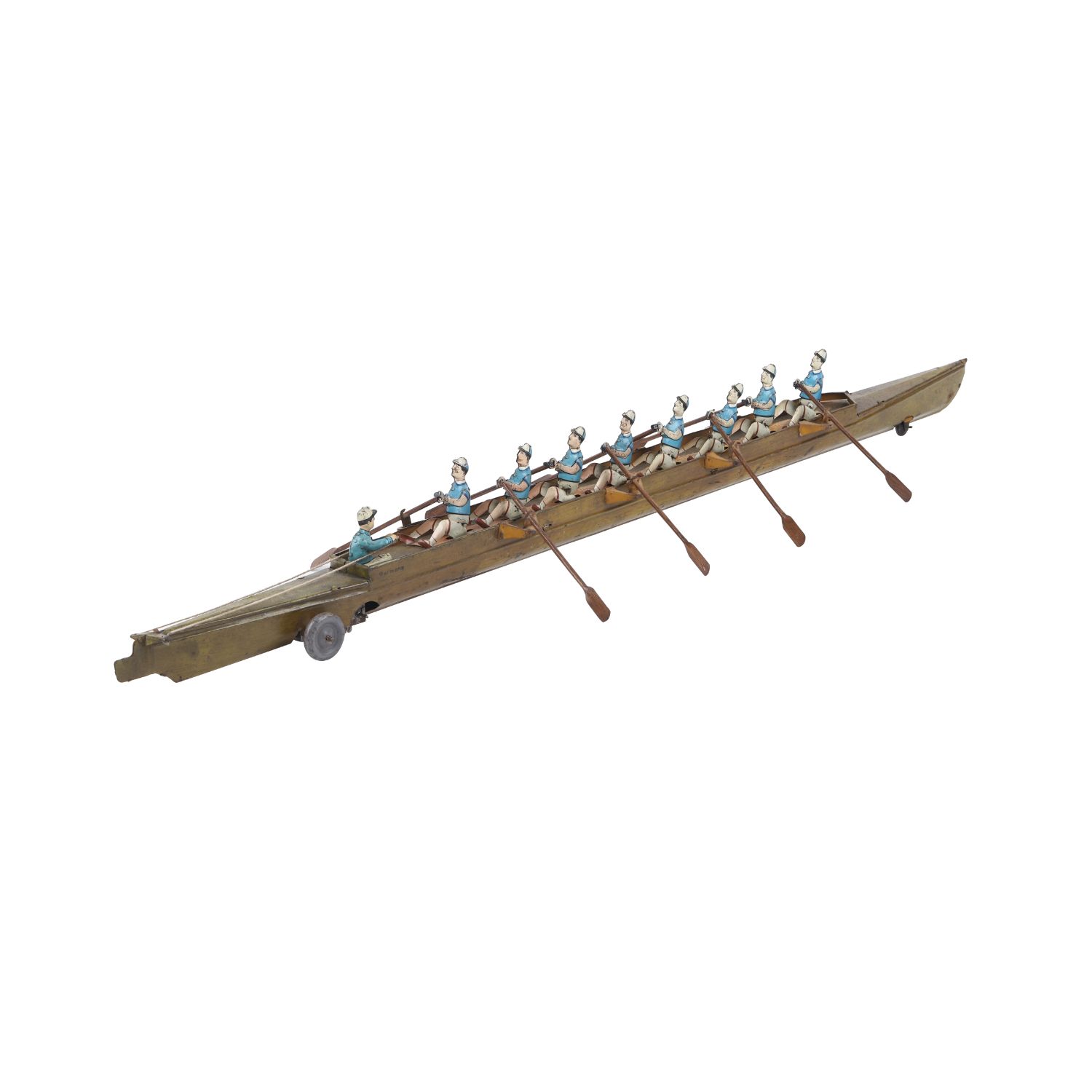 Extremely rare circa 1920 lithographed tin eight-man scull with coxswain toy made by Gunthermann, one of the elite German toy companies, 29 inches long (CA$21,240).