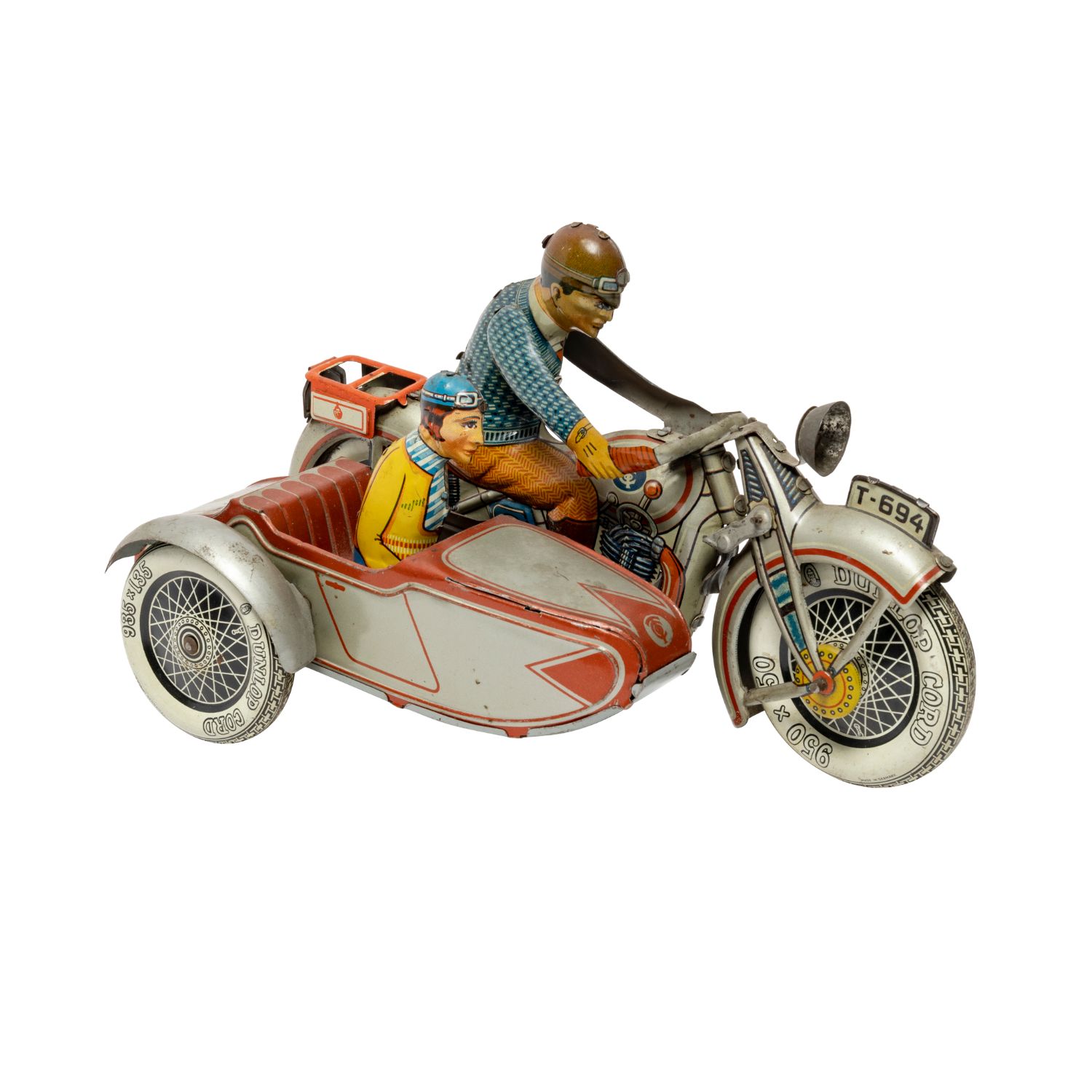 A German 1930s lithographed tin T-694 toy motorcycle with sidecar, made by Tipp & Co., a company known for their high-quality and realistic toys, fetched $15,340, against a $3,000 high estimate. It was a great display piece, with excellent gloss and color, and was tested and working.