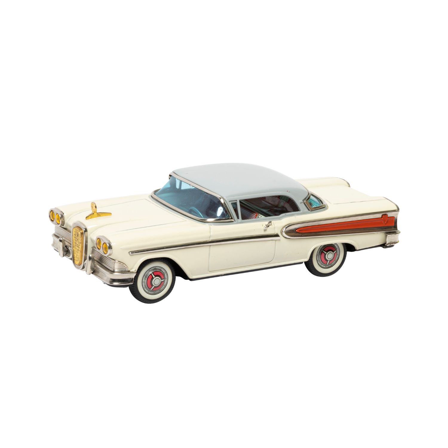 A toy Ford Edsel, made in Japan in the 1950s by the Asahi Toy Company (ATC), chugged off for $4,720. Asahi was a major post-war maker of mechanical toys with a specific emphasis on scale-like models of then-contemporary vehicles, also best known for their Santa Claus logo.