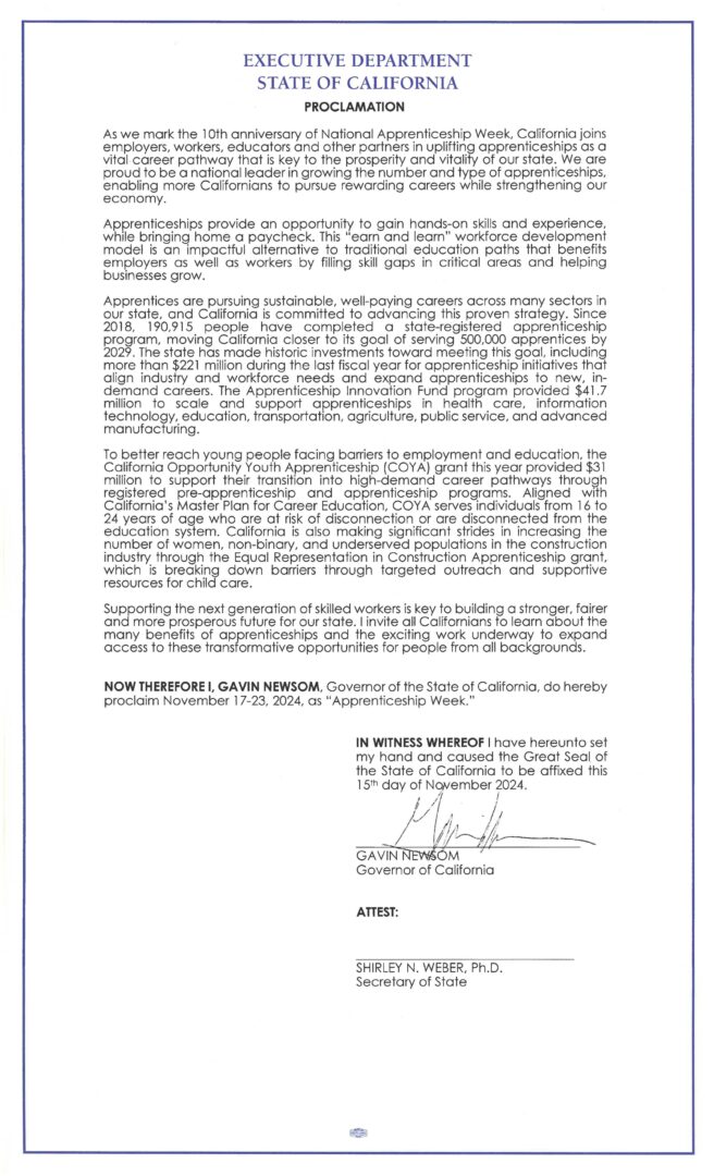 SACRAMENTO – Governor Gavin Newsom today issued a proclamation declaring November 17-23, 2024, as “Apprenticeship Week.”