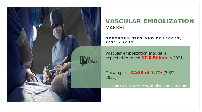 PORTLAND, OR, UNITED STATES, November 18, 2024 /EINPresswire.com/ -- The vascular embolization market is experiencing robust growth, with its valuation projected to rise from $3.7 billion in 2021 to $7.8 billion by 2031, at a compound annual growth rate (CAGR) of 7.7%. The growth reflects an increasing reliance on minimally invasive procedures for managing vascular diseases and related conditions.