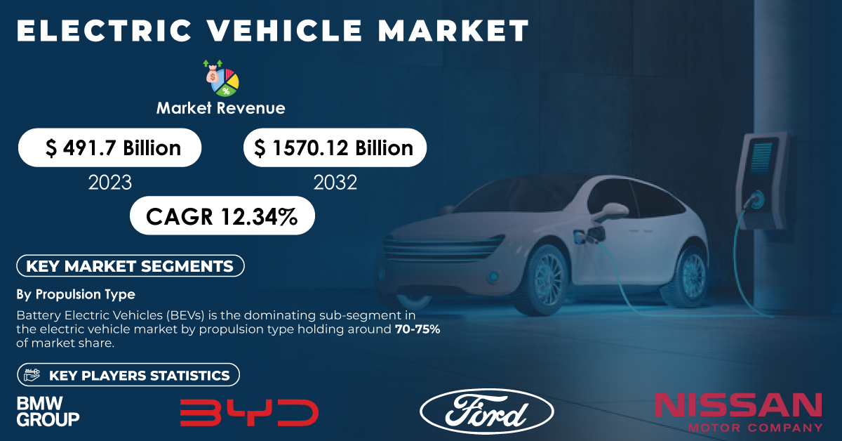 The Electric Vehicle Market was valued at USD 491.7 billion in 2023 and is expected to reach USD 1570.12 billion by 2032, growing at a CAGR of 12.34% over the forecast period of 2024-2032.