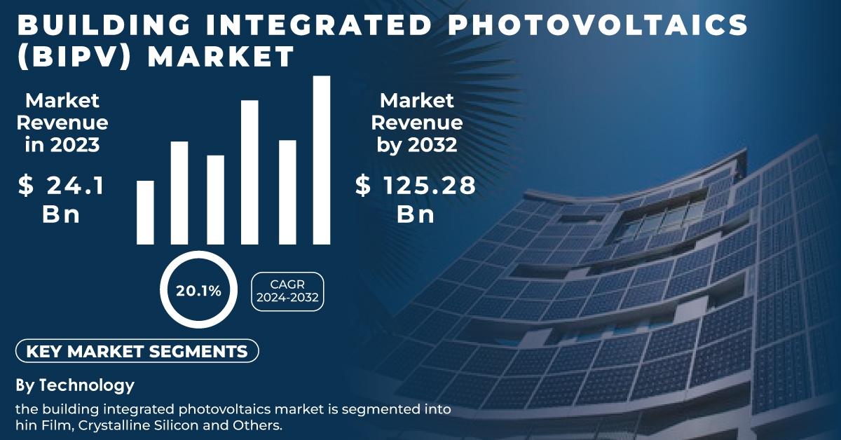 AUSTIN, TX, UNITED STATES, November 21, 2024 /EINPresswire.com/ -- The Building Integrated Photovoltaics (BIPV) Market Size was valued at USD 24.1 billion in 2023 and is expected to reach USD 125.28 billion by 2032 with a growing CAGR of 20.1% over the forecast period 2024-2032.Growth Scope and Future Opportunities in the Building Integrated Photovoltaics (BIPV) Market Driven by Sustainable Architecture