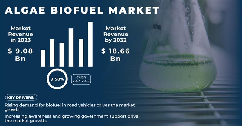 The Algae Biofuel Market was valued at USD 9.08 billion in 2023 and is expected to reach USD 18.66 billion by 2032, growing at a CAGR of 9.58% over the forecast period of 2024-2032.