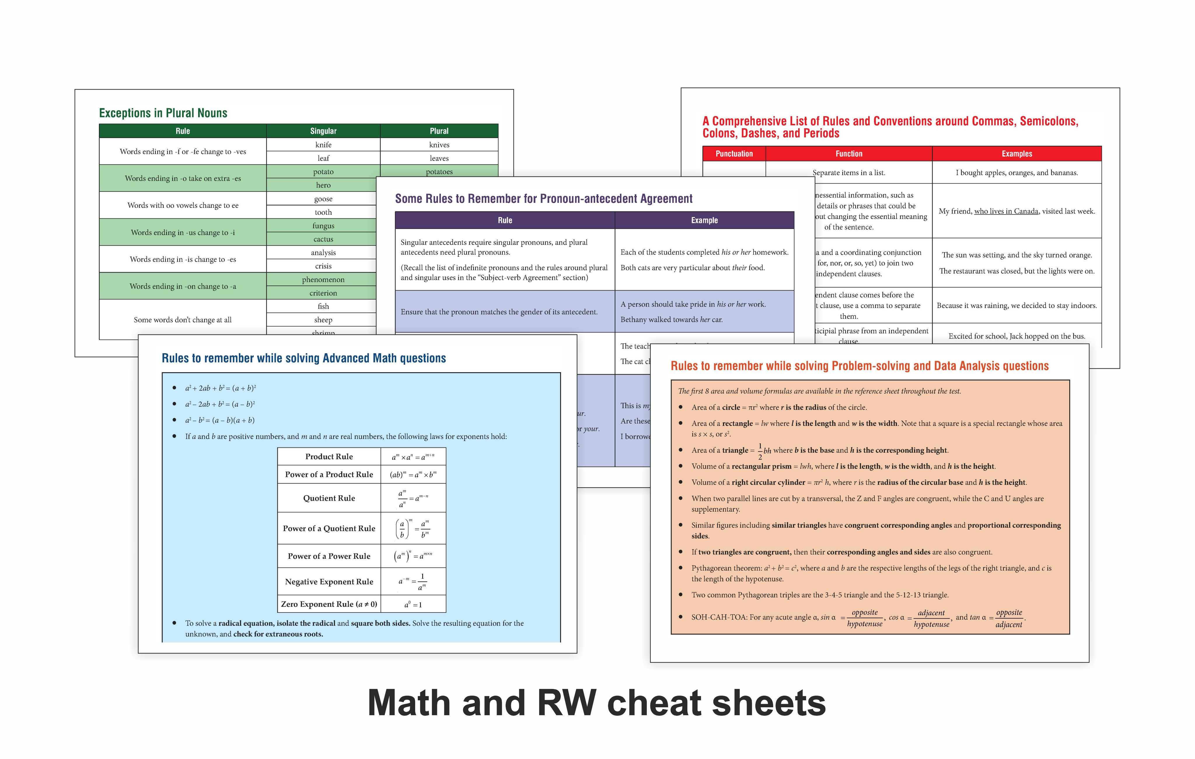 From the online resources of the book, test takers can access cheat sheets filled with math formulas and grammar rules and a list of essential vocabulary words to brush up on test day.