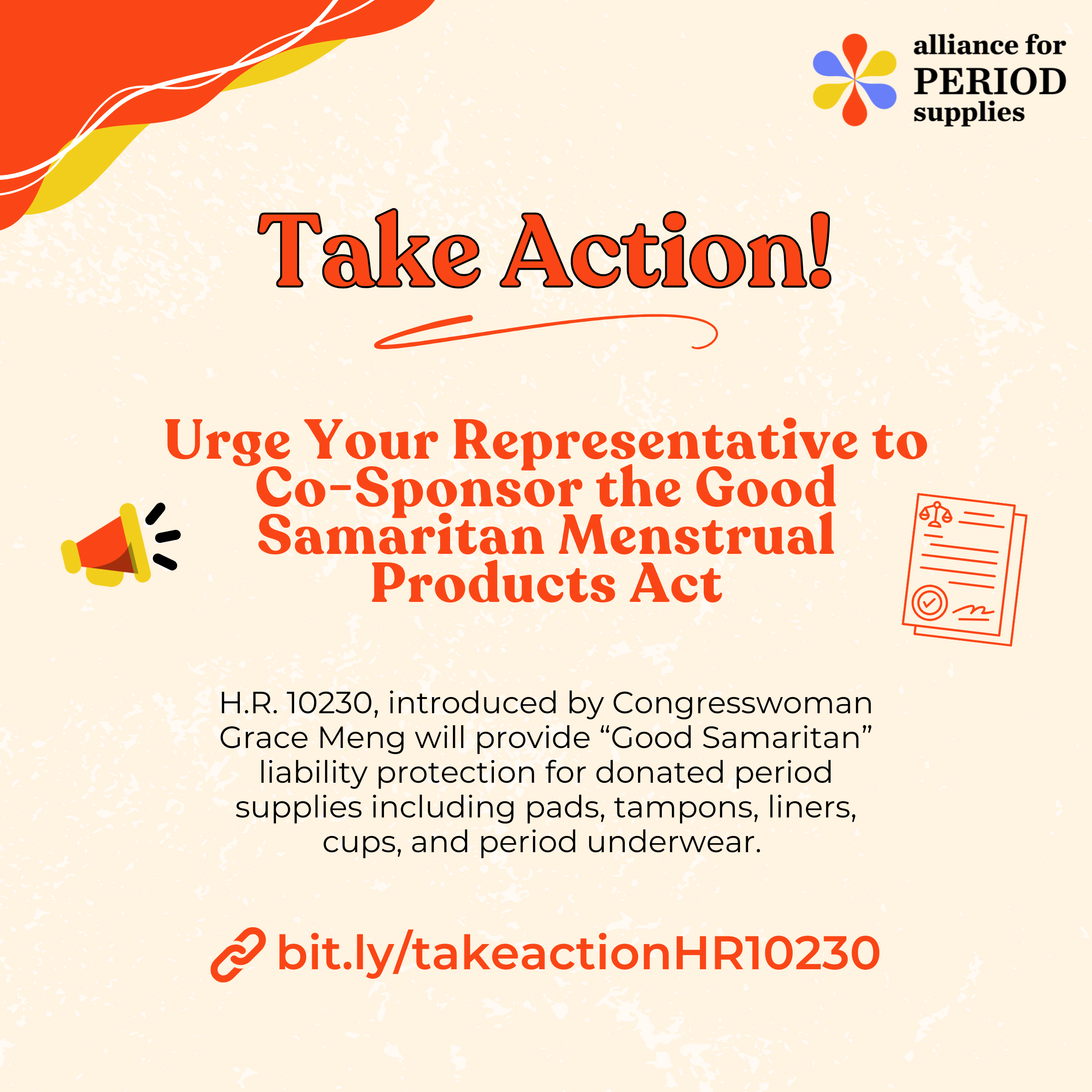 The Alliance for Period Supplies urges individuals, organizations, and companies to contact their Representatives and advocate for co-sponsorship and passage of this critical legislation.