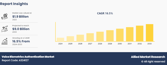 WILMINGTON, DE, UNITED STATES, November 25, 2024 /EINPresswire.com/ -- Allied Market Research published a report, titled, "Voice Biometrics Authentication Market by Type (Active Biometrics and Passive Biometrics), Deployment Mode (On-Premise and Cloud), Enterprise Size (SME and Large Enterprise), and Industry Vertical (BFSI, Retail and E-commerce, Telecommunications and IT, Government and Defense and Others): Global Opportunity Analysis and Industry Forecast, 2024-2033". According to the report, the voice biometrics authentication market was valued at $1.9 billion in 2023, and is estimated to reach $9.0 billion by 2033, growing at a CAGR of 16.5% from 2024 to 2033.Prime Determinants of Growth