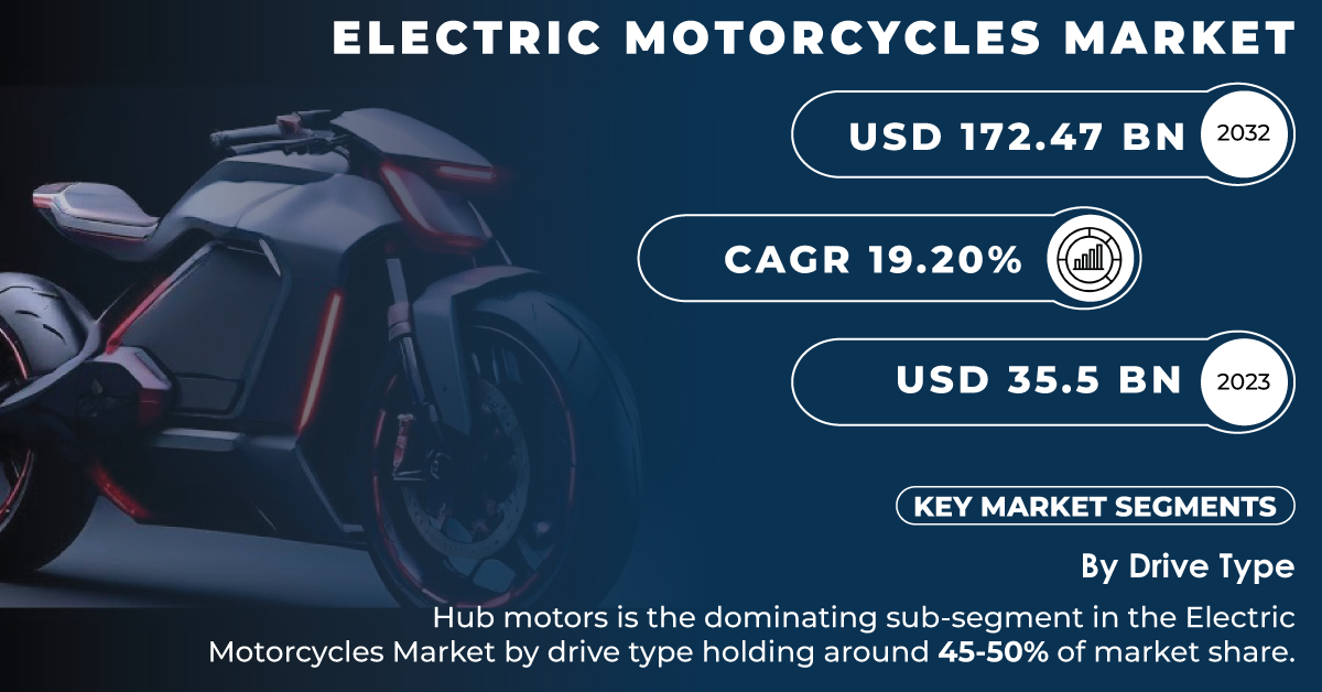 The Electric Motorcycles Market was valued at USD 35.5 billion in 2023 and is expected to reach USD 172.47 billion by 2032, growing at a robust CAGR of 19.20% over the forecast period from 2024 to 2032.