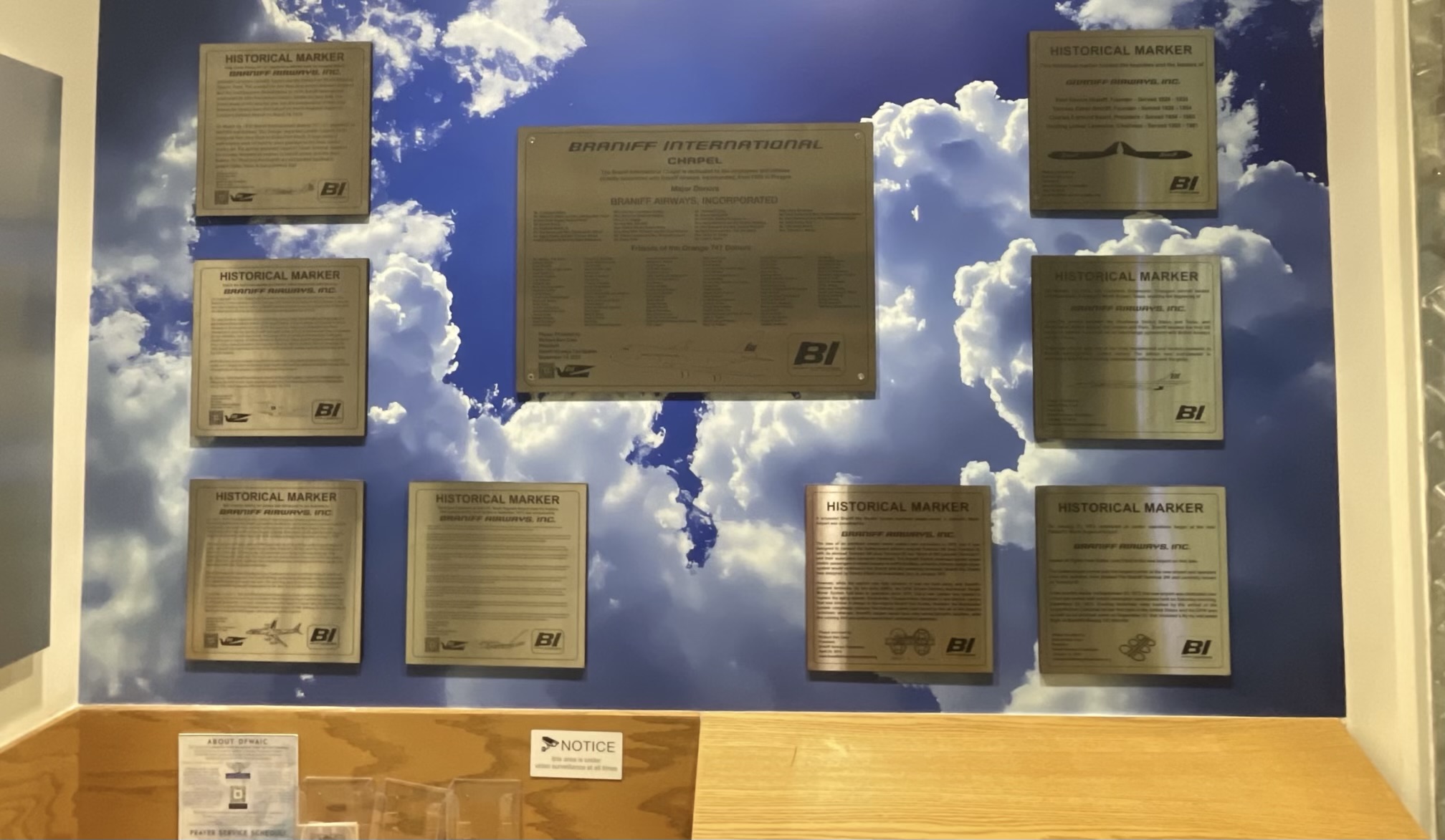 At DFW Airport, nine new plaques were installed at the vestibule entrance to the Braniff Chapel near Gate 29, in the former Braniff Terminal 2W, now Terminal B. Father Greg McBrayer, Director of the DFW Chaplaincy, commented that the plaques, “will greet our many visitors to the chapel and enable them to learn about the key role that Braniff played in the opening and growth of DFW Airport.”