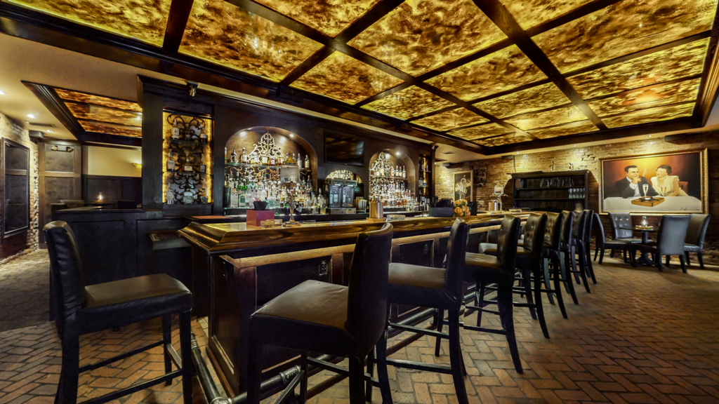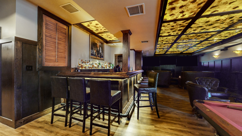Red Phone Booth features a stunning interior reminiscent of a clandestine hideaway as the venue showcases an exquisite design that includes vintage-inspired décor, plush seating, and dimly lit surroundings, creating an atmosphere that exudes timeless elegance. The venue decor is highlighted by 100-year-old reclaimed brick walls from a textile mill, honey onyx bars, intimate fireplaces, custom Italian leather couches, and hand-painted ceiling with back lighting by renowned artist Christian Waggoner (Star Wars / Lucas Arts) as well as his fine art throughout. Each Red Phone Booth location offers a private event space, the Mafia Room, that is available for rent for private events.
